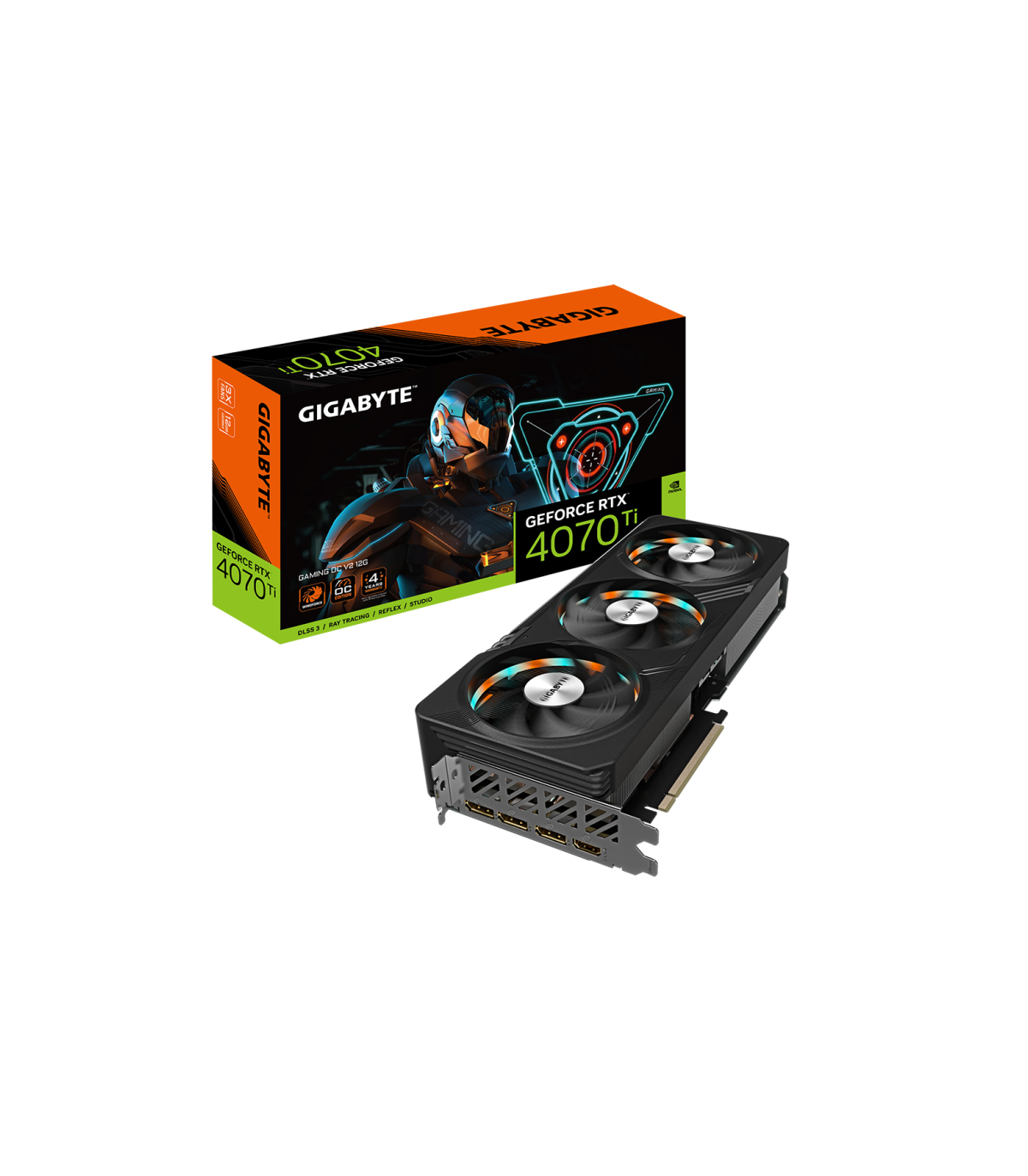 Gigabyte GeForce RTX 4070 Ti GAMING OC V2 12G. Familia de procesadores de gráficos: NVIDIA, Procesador gráfico: GeForce RTX 4070 Ti, Frecuencia del procesador: 2640 MHz. Capacidad memoria de adaptador gráfico: 12 GB, Tipo de memoria de adaptador gráfico: GDDR6X, Ancho de datos: 192 bit. Máxima resolución: 7680 x 4320 Pixeles. Versión DirectX: 12 Ultimate, Versión OpenGL: 4.6. Tipo de interfaz: PCI Express 4.0. Tipo de enfriamiento: Activo, Número de ventiladores: 3 Ventilador(es)