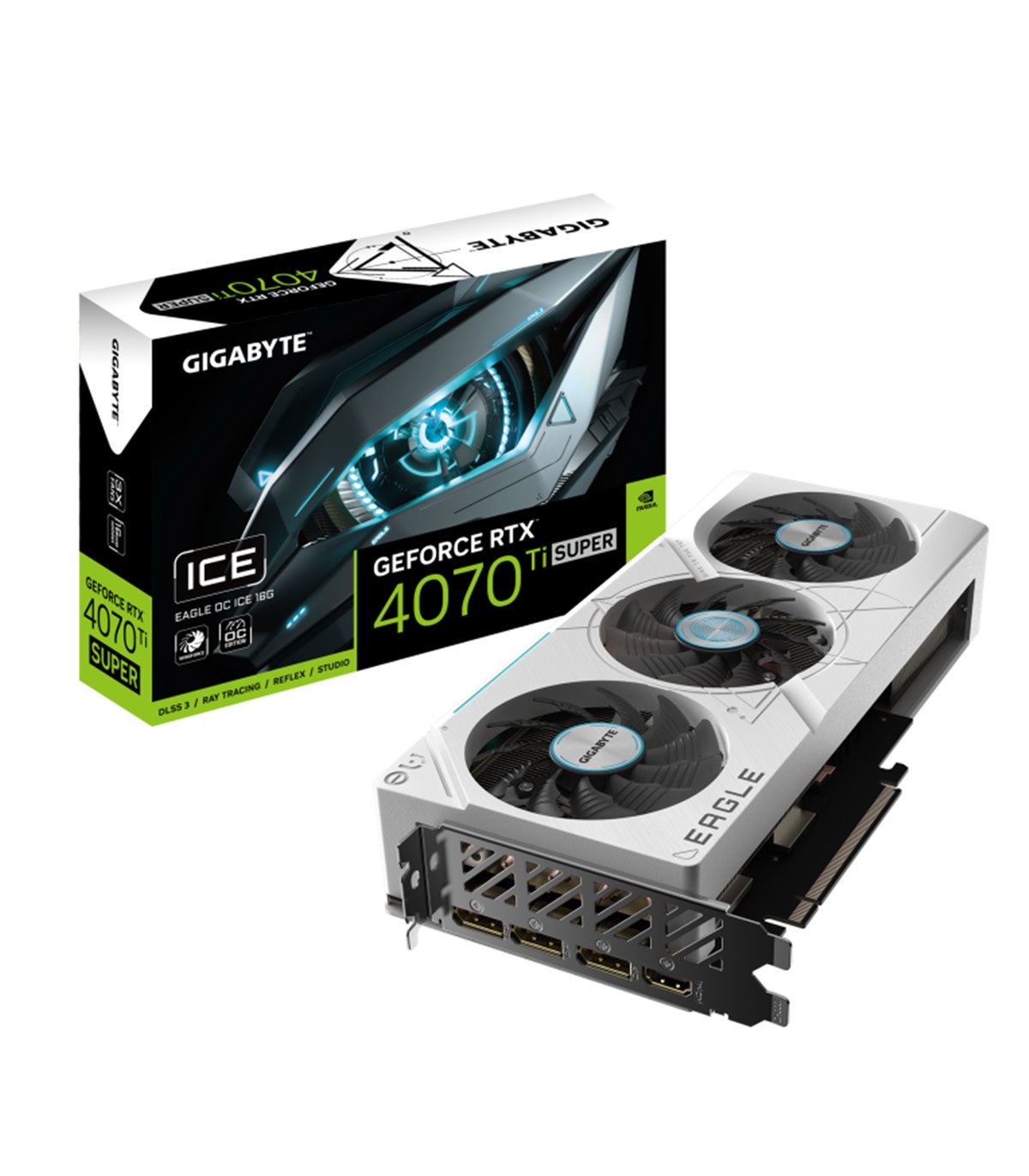 Gigabyte GeForce RTX 4070 Ti SUPER EAGLE OC ICE 16G. Familia de procesadores de gráficos: NVIDIA, Procesador gráfico: GeForce RTX 4070 Ti SUPER. Capacidad memoria de adaptador gráfico: 16 GB, Tipo de memoria de adaptador gráfico: GDDR6X, Ancho de datos: 256 bit, Velocidad de memoria del reloj: 21000 MHz. Máxima resolución: 7680 x 4320 Pixeles. Versión DirectX: 12 Ultimate, Versión OpenGL: 4.6. Tipo de interfaz: PCI Express 4.0. Tipo de enfriamiento: Activo, Número de ventiladores: 3 Ventilador(es)
